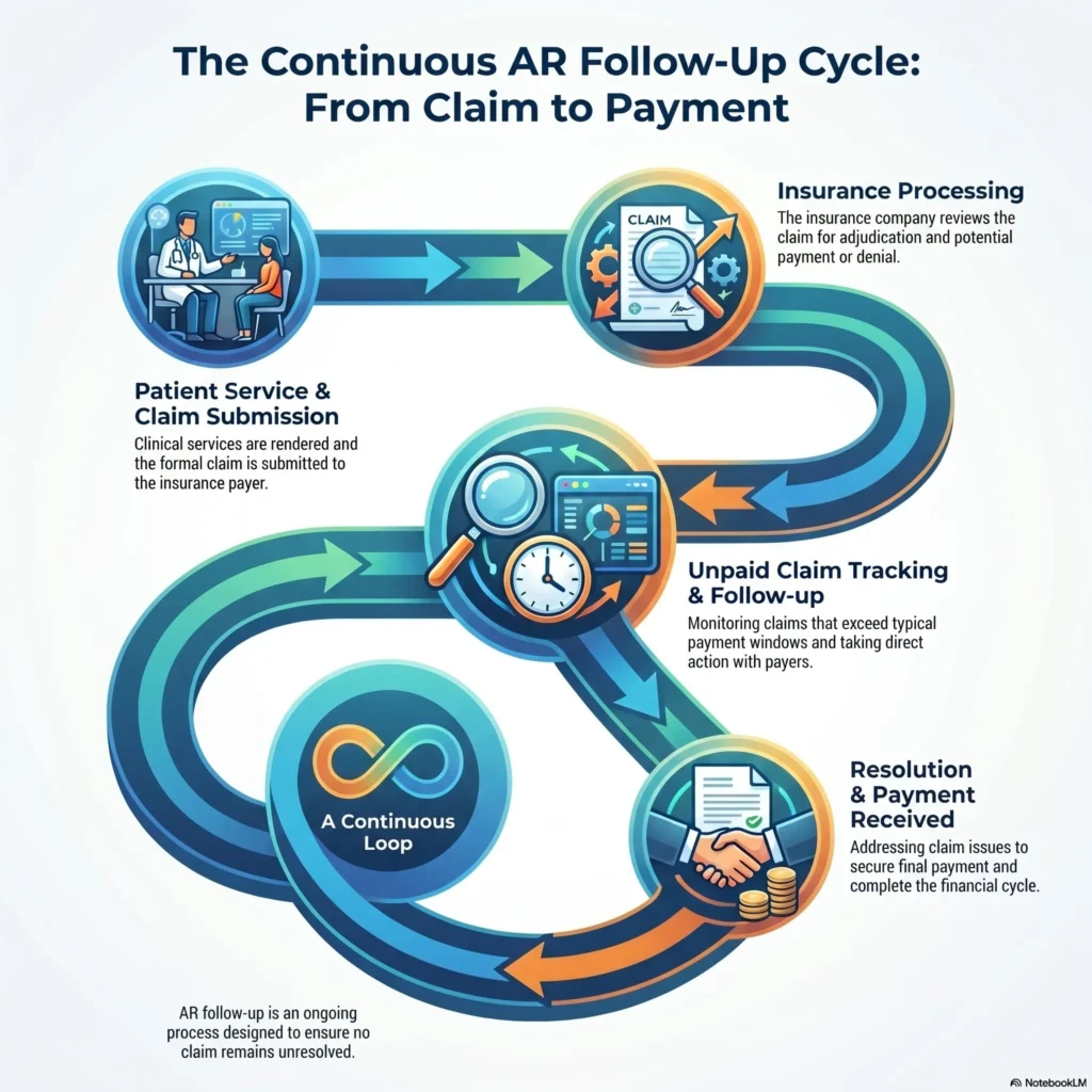 AR follow-up is the process of tracking unpaid claims and taking action to secure payment from insurance companies or patients.